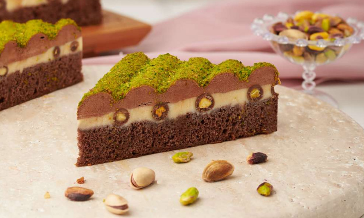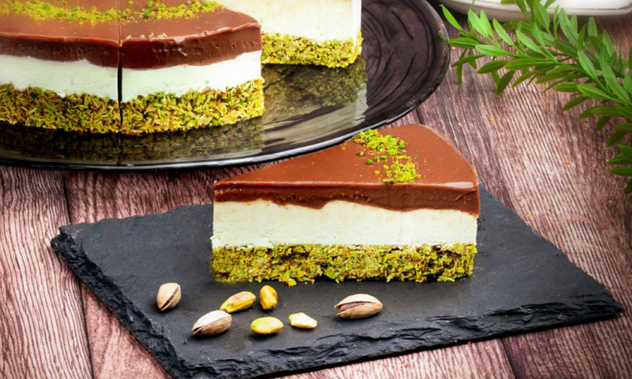 Pandispanya üzeri siyah ve beyaz krema, gerçek Antep fıstığı
