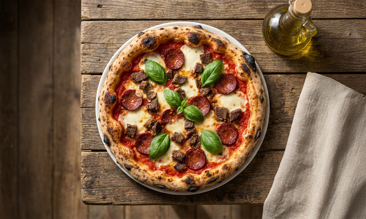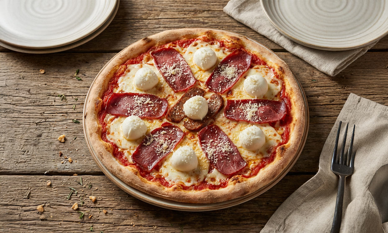 Domates sosu, Mozarella, Dana füme, Pastırma, Mergez, Top mozzarella, Parmesan