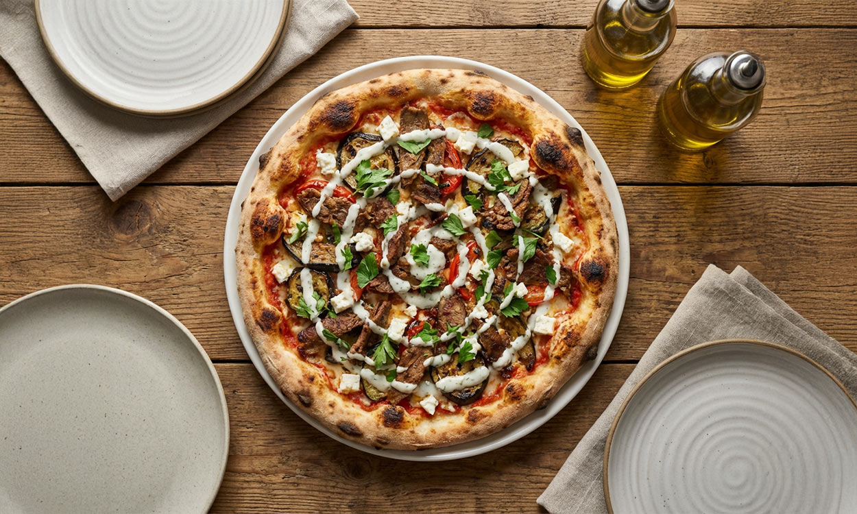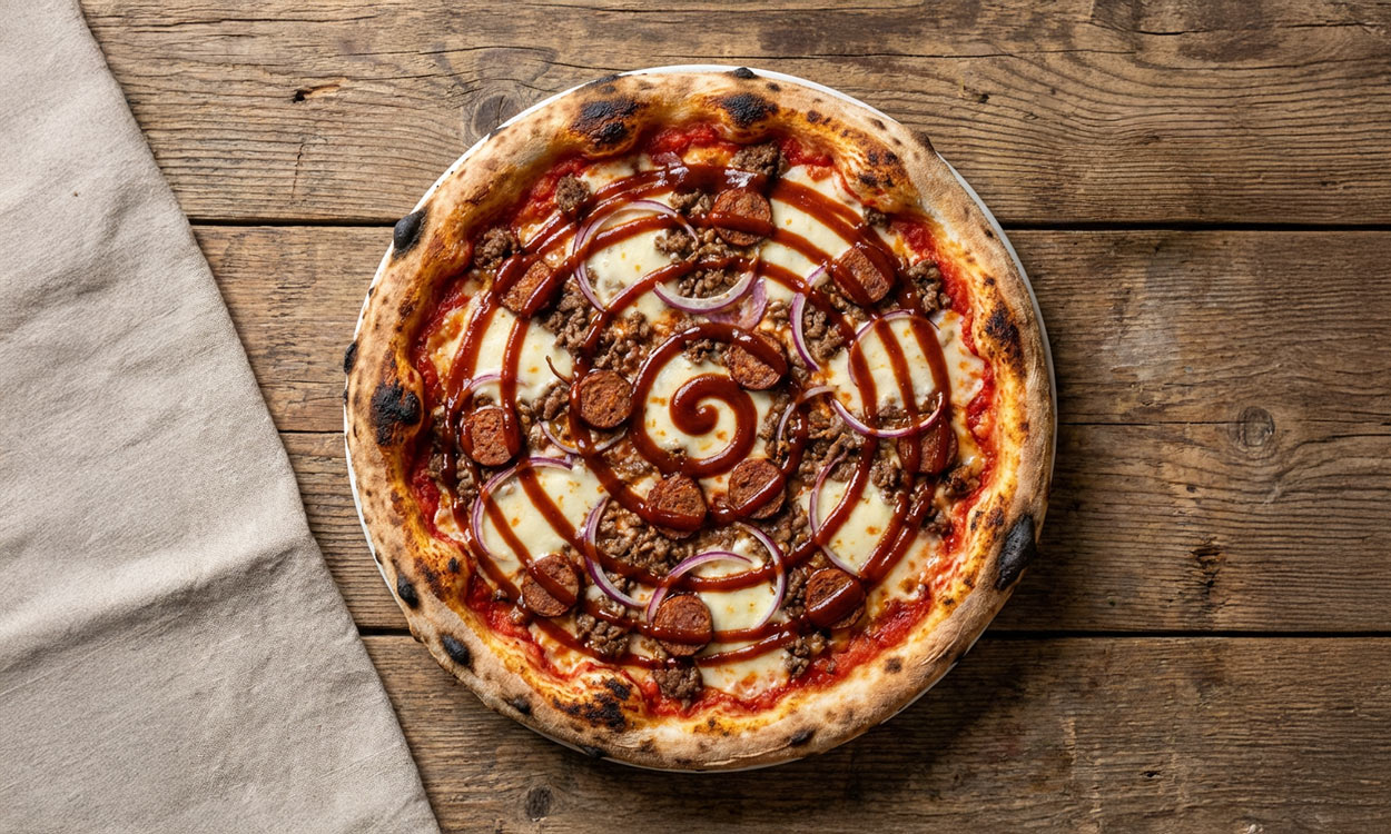Domates sosu, Mozzarella, Kıyma, Mergez, Soğan, Barbekü sosu