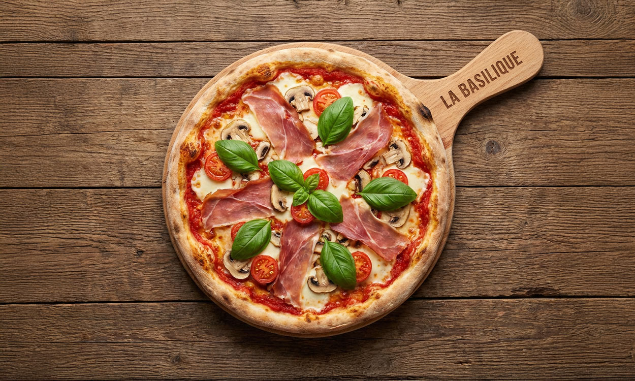 Domates sosu, Mozzarella, Dana jambon, Mantar, Taze Domates, Fesleğen