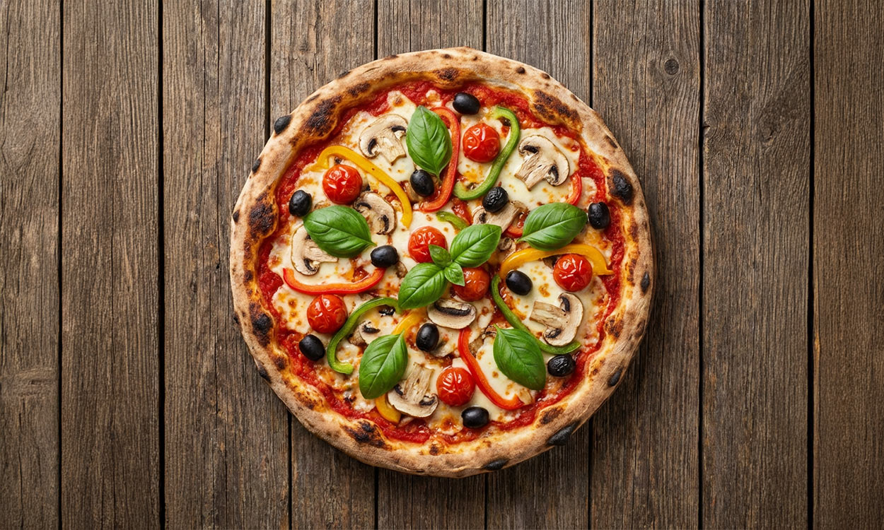 Domates sosu, Mozzarella, Mantar, Biber, Taze domates, Zeytin, Fesleğen