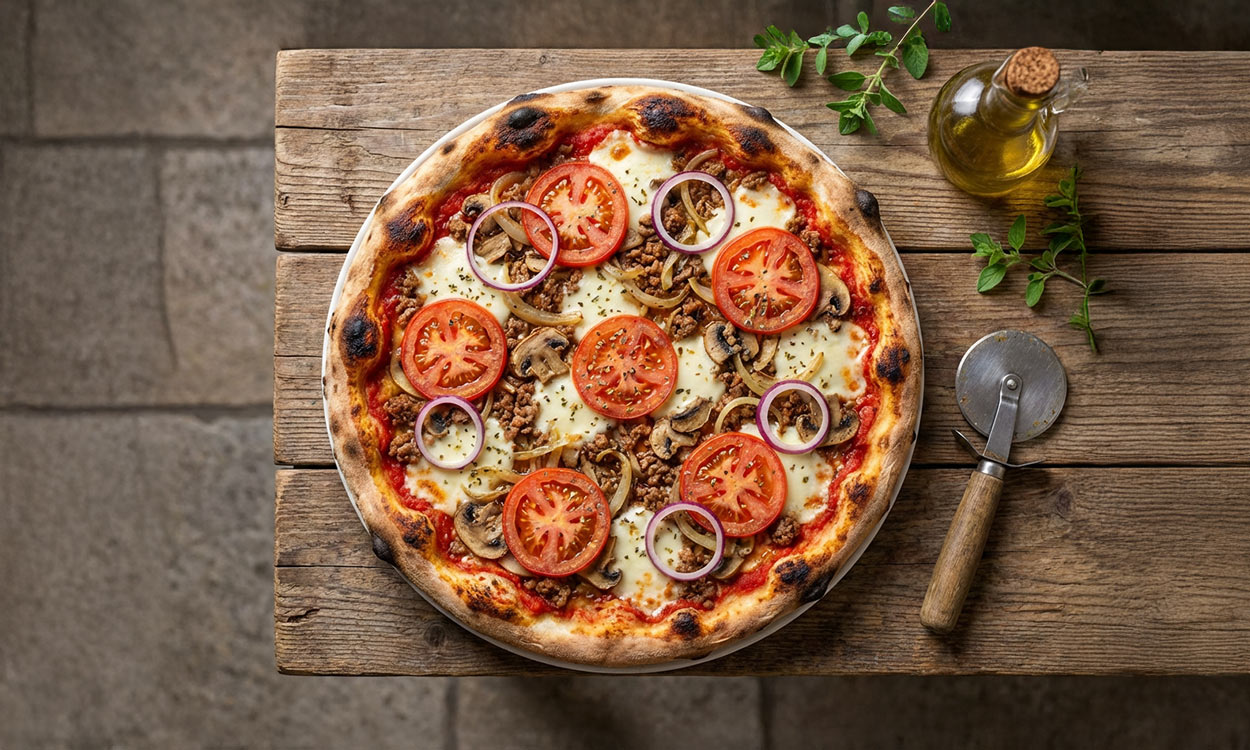 Domates Sosu, Mozzarella, Soğan, Mantar, Kıyma, Taze domates, Origan, Soğan halkası